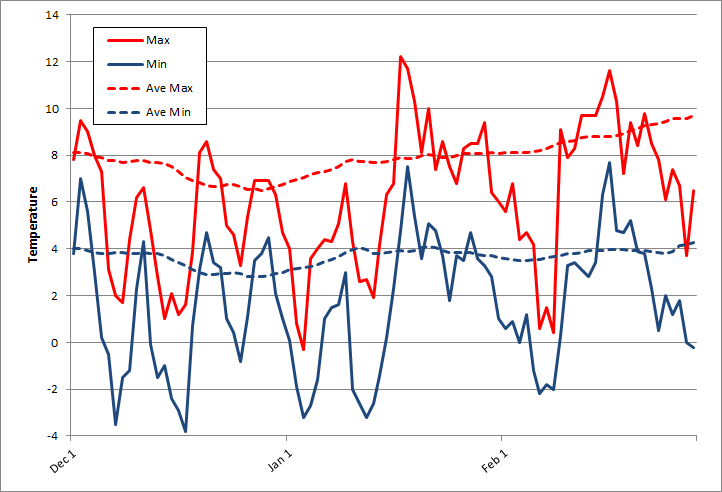 The chart below compares the daily maximum and minimum temperatures this winter with the 30-year average temperatures. You can see that the temperatures were pretty consistently below average, with just a couple of brief spells of milder weather.