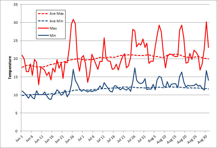The average daily high temperature this summer was 20.5 C (versus the normal of 20.0 C) while the average daily minimum was 12.0 C (normal 11.5 C).
